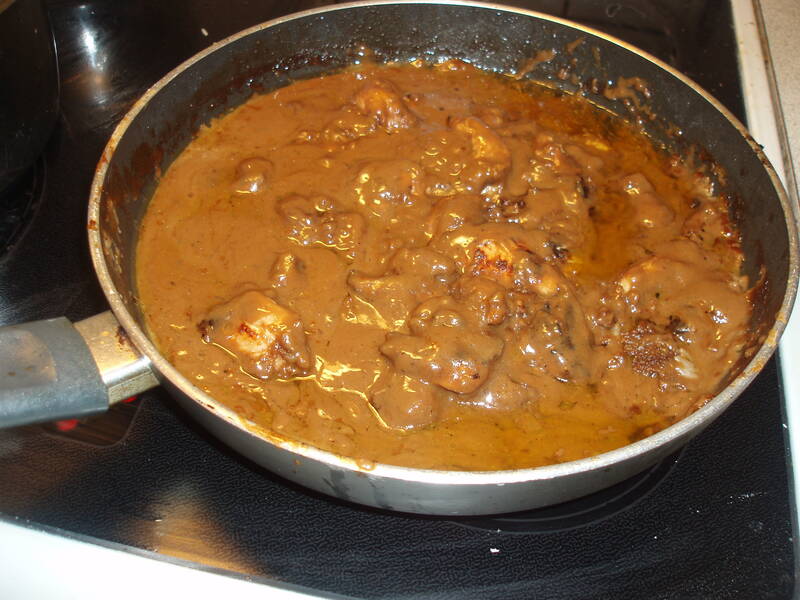 När såsen börjar tjockna så tillsätt grädden och jordnötssmöret, rör om tills jordnötssmöret smält.